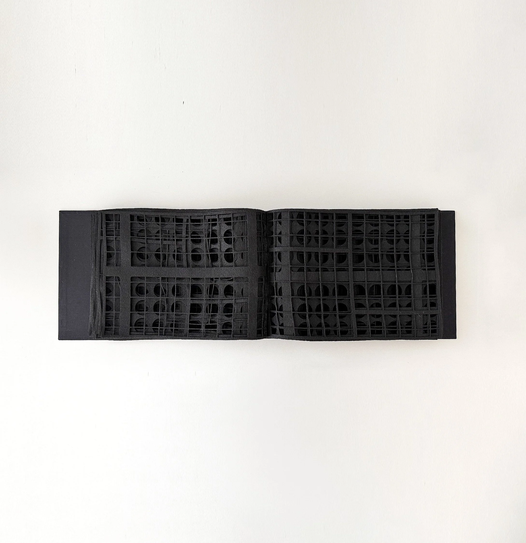 O uso do feltro — material sensível, macio, de origem industrial — é aqui confrontado pela precisão técnica do corte a laser. Essa fricção entre o orgânico e o mecânico produz uma tensão sutil: há uma regularidade geométrica que aponta para a abstração moderna, mas que é logo distendida pelas curvaturas naturais do tecido, pelas imperfeições do manuseio, pelas dobras imprevisíveis. O livro se transforma, assim, em um corpo que respira.